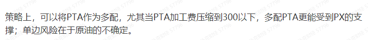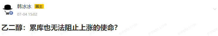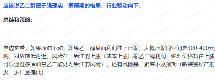 “现在的乙二醇是,库存累库+累库预期+低利润。虽然乙二醇有很强的累库预期,但生产利润很低,做空性价比不好,尤其在原油偏强的情况下,乙二醇的价格也会偏强,原油如果上涨,乙二醇的使命就是上涨。针对后面的乙二醇,做多可能就是押注看涨原油,或者装置集中因利润停车了,做多。做空,只能等利润稍微好些时候做点,还有警惕原油会不会涨。”