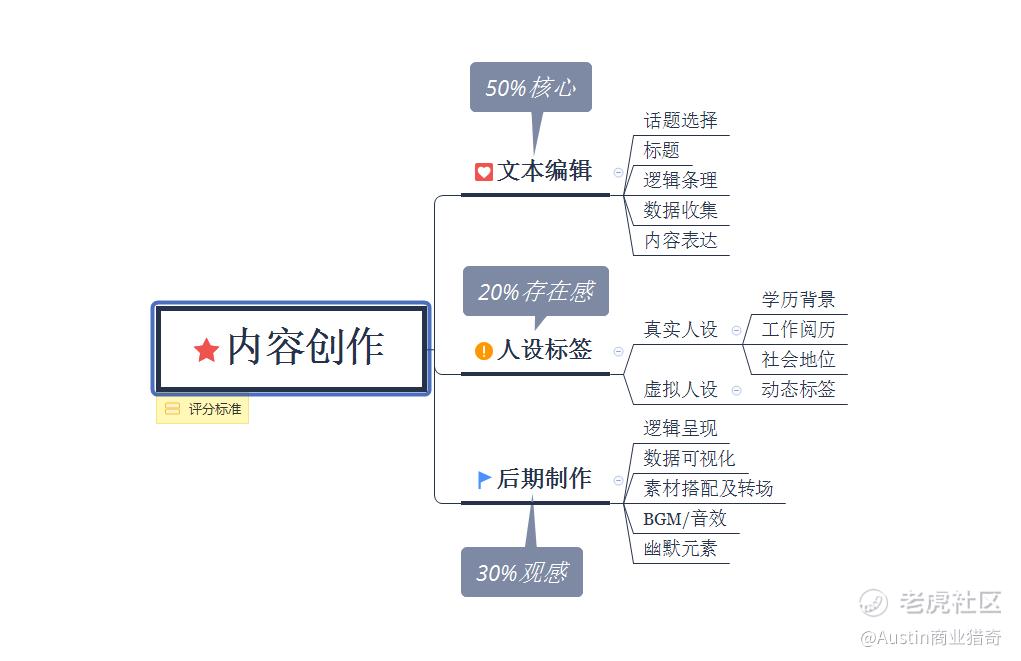 3,一期完整的商业财经视频(100分)=50分的文本编辑(核心输出)+20分的人设标签(存在感)+30分的后期制作(观感)