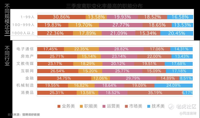 百人以内规模企业业务类离职率最高,与上季度相比呈现升高趋势;千人以内规模企业运营类离职率最高;千人以上规模企业技术类离职率最高,业务类人才离职率有所上升。
