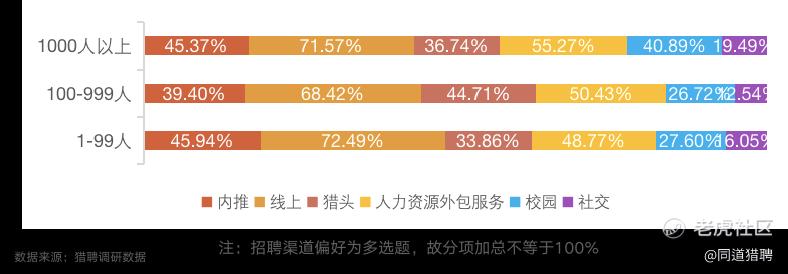 从企业规模来看,企业规模越大,渠道选择越多元,对线上、外包服务和校园的使用占比越高,而百人以下的小规模企业更加注重公司品牌输出,倾向通过线上和内推的方式影响候选人。