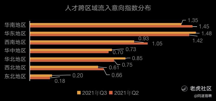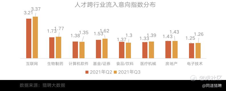 对比2021年Q2及2021年Q3,华东地区、华南地区人才跨区域流入意向较高;互联网、生物制药、计算机软件等行业跨行业人才流入意向较高。