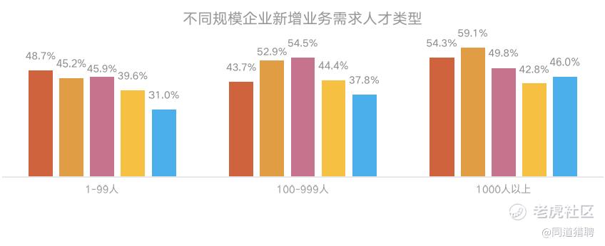 在四季度,受限企业业务调整及变化,不同规模企业招聘的侧重点也有所差异:企业规模越大,业务类、职能类、技术类需求越高。其中,100人以下小型企业重视业务类招聘,寻求快速变现;100-999人规模企业重视运营,寻求市场增量;1000人以上规模企业重视技术招聘,寻求产品创新。