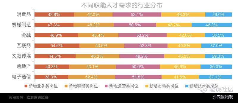 从行业看,业务调整和变化给企业带来更多运营类需求,运营职能增长明显;其中,消费品、金融行业运营类需求增多,机械制造技术类岗位增多最为明显,互联网主要体现在业务和职能类岗位需求,电子通信、房地产主要是职能类岗位增长。
