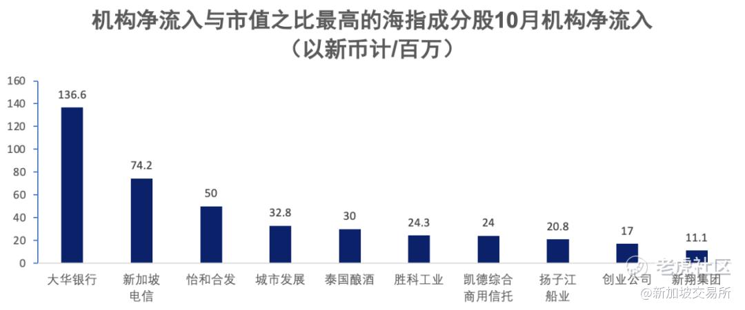 此外,海指10月机构净流入达2.95亿新元,30只股票中有18只录得净流入。海指成分股——胜科工业、怡和合发、城市发展、扬子江船业和创业公司10月的机构净流入与月末市值之比率最高,价格平均上涨7.9%。机构净流入与月末市值之比紧随其后的5只海指成分股平均涨幅为4.0%,与海指3.6%的涨幅相若。