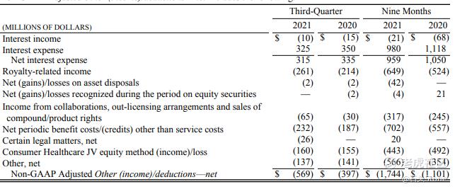 与上年同期相比,2021年第三季度运营费用增长了8%,与上年同期相比,其他成本更接近于大流行前水平。2021Q3研发费用同比增长49%,以开发和商业化ARV-471,并增加在多个治疗领域的投资。包括与新冠病毒抗病毒项目开发和风险制造相关的额外支出。辉瑞在2021Q3记录了17亿美元的其他净收入,而在2020Q3,其他扣除净额为19亿美元。