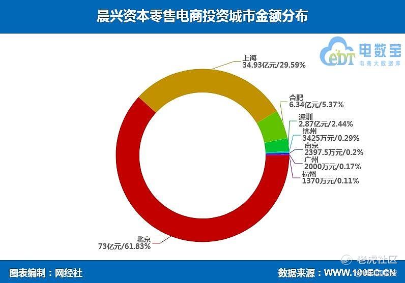 金额城市分布上看,北京投资73亿元,占61.83%;上海投资34.93亿元,占29.59%;合肥投资6.34亿元,占5.37%;深圳投资2.87亿元,占2.44%;杭州投资3425万元,占0.29%;南京投资2397.5万元,占0.2%;广州投资2000万元,占0.17%;福州投资1370万元,占0.11%。