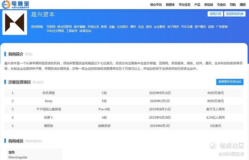 据网经社“电融宝”投资方库显示,晨兴资本是一个从事早期风险投资的机构,目前所管理资金规模超过十七亿美元,投资方向主要集中在医疗保健、互联网、信息服务、媒体、软件、通讯、生命科技和教育等领域,为创业企业提供种子期、早期及成长期资金,对每一家企业的初始投资额通常在五十万美元以上,并追加投资于业绩良好的已投资企业中。