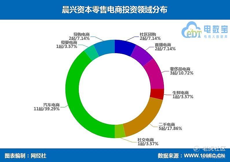 零售电商赛道上,晨兴资本投资汽车电商共11起,占比39.29%;二手电商共5起,占比17.86%;奢侈品电商有3起,占10.72%;导购电商、社区团购、直播电商投资各2起;母婴电商、社交电商、生鲜电商均为1起。