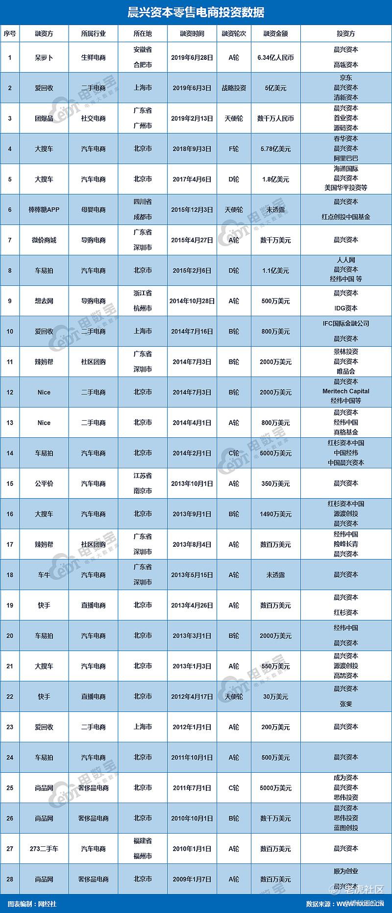 据网经社“电数宝”(DATA.100EC.CN)大数据库监测数据显示,2016年1月至2021年10月,晨兴资本累计参与了28起零售电商领域的投资,涉及公司分别为:呆萝卜、爱回收、团爆品、大搜车、棒棒糖APP、微价商城、车易拍、辣妈帮、Nice、公平价、快手、车牛、尚品网、273二手车等。