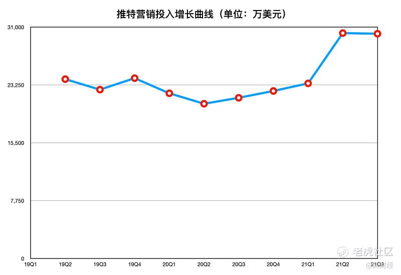 去年疫情期间,许多互联网公司享受到了一波市场红利,推特也不例外,Q1、Q2季度增速分别为9%、12%,遗憾的是,愉快的时光总是太短,去年Q3以来便陷入低增长陷阱,最近两季同比增幅均为3%。即便如此低的增长也来之不易,2021年第二季度营销费用较去年同期暴增46%,第三季度继续在高位运行。换句话说,如果没有高投入,推特大概率连3%的mDAU都维持不了。