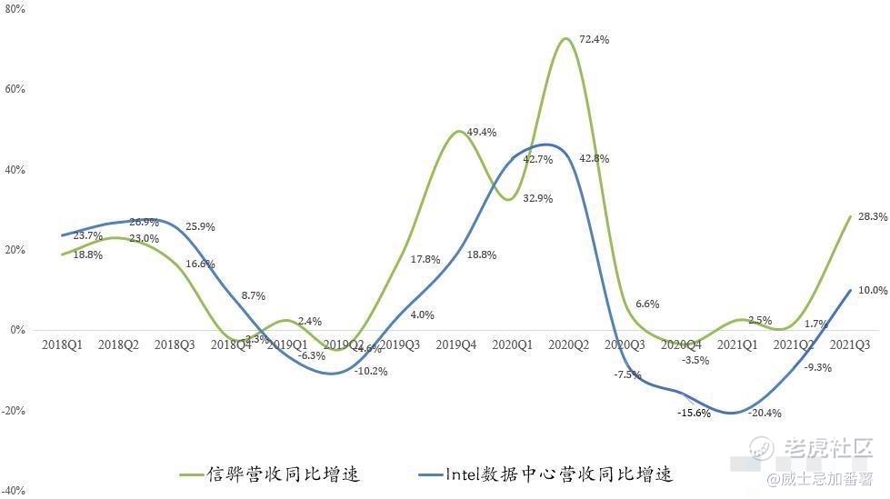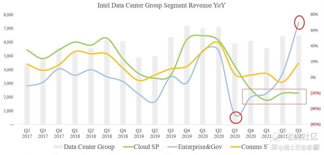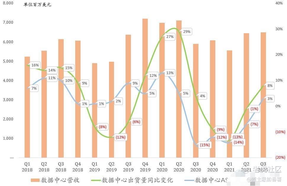 好消息是Intel Q3数据中心真的触底反弹了。领先指标信骅Q3营收同比增长28.3%,结束长达4个季度的颓势。我们昨天在《财报前瞻》中预测Intel Q3数据中心营收有望同比增长15%,达68亿美元,环比微增。实际营收64.96亿美元,同比仅增长10%。