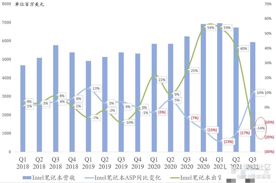 拖累Intel PC业务的是目前PC最重要笔记本业务。Intel Q3笔记本出货量同比下滑14%,2020年以来首次下滑! ASP同比增长10%,结束连续4个季度的下跌。Q3桌面业务反而表现更好, 出货量同比增长16%,ASP同比增长4%,实现量价齐升。近年来表现异常优异的网卡等附属业务Q3同比暴跌35%。
