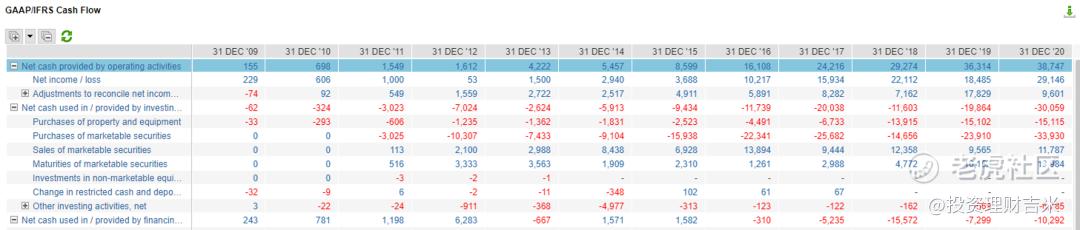 那不借钱的话,Facebook的现金流会不会吃紧呢?要知道隔壁Netflix,特斯拉都是在借钱借到天花板的情况下,仍然现金流吃紧的公司。这样,我们再来看一下他的Cash Flow Statement。可以看到,反应公司经营状况的营业现金流逐年成指数型增长,别说吃紧,富裕到都花不完。每年需要几百亿几百亿的买国债来管理现金。