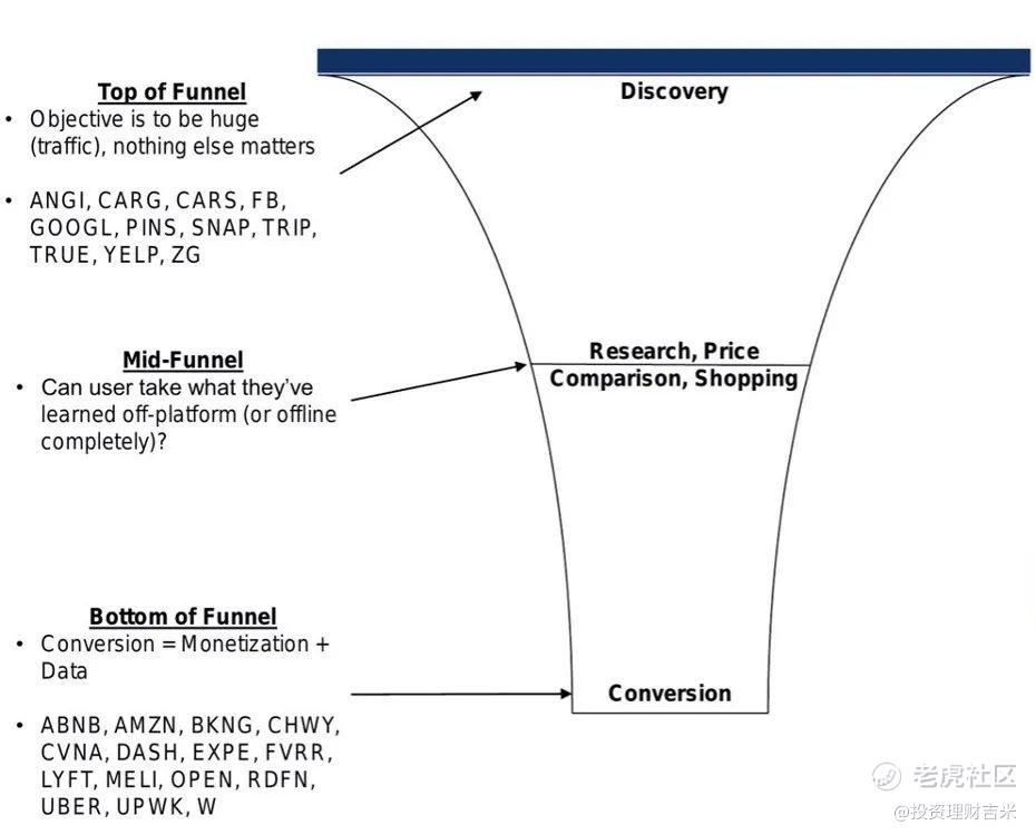 这就要说到互联网行业中著名的漏斗理论了。在互联网公司的发展中,有且仅有两种发展模式。第一种是尽可能的获取用户,等规模做大了,在进入下一阶段,利用现有用户和数据进行变现。比较典型的案例就是Google和微信。另一种发展模式,是在一开始就寻找各种变现方式,然后通过营销手段形成良性循环,打开更多的客户群,从而发展壮大。最经典的例子就是亚马逊,uber和阿里巴巴。就像这张图所展示的,第一种模式,先吸纳用户再变现的方式,就是从漏斗的大口往下发展到小口的模式。第二种模式,先找变现方式,在扩大用户群,就是从漏斗的小口往上发展到大口的模式。