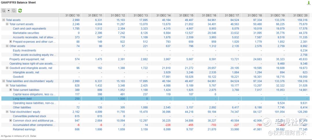 再来看他的Balance Sheet,这里有一行数据非常令人费解,就是long term debt长期借贷。Facebook这家公司几乎是从不借钱,要知道这对于一家公司来说并不是什么好事,尤其在当前极低利率的环境下。不借钱,说明公司的杠杆率过低,有很大的发展潜力没有释放。如果你看苹果,微软,亚马逊的财报,哪个不是利用自己的影响力,以极低的成本借百亿千亿的钱来发展项目。而Facebook明明也有能力这么做,但却丝毫没有。