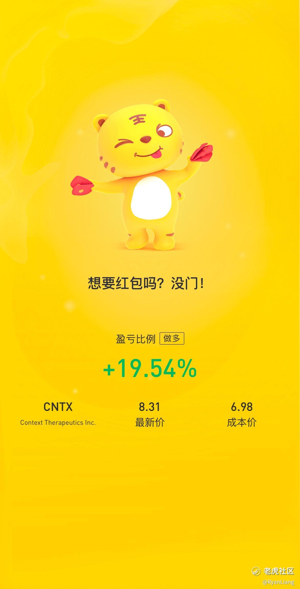 空间站里的$Context Therapeutics Inc.(CNTX)$ 盘后涨到了8.65 (20%+) 我已卖出一半, 虽然很多大佬目标价11-13-15, 我还是稳妥地认为要在个位数出掉90%, 其余的let it run.