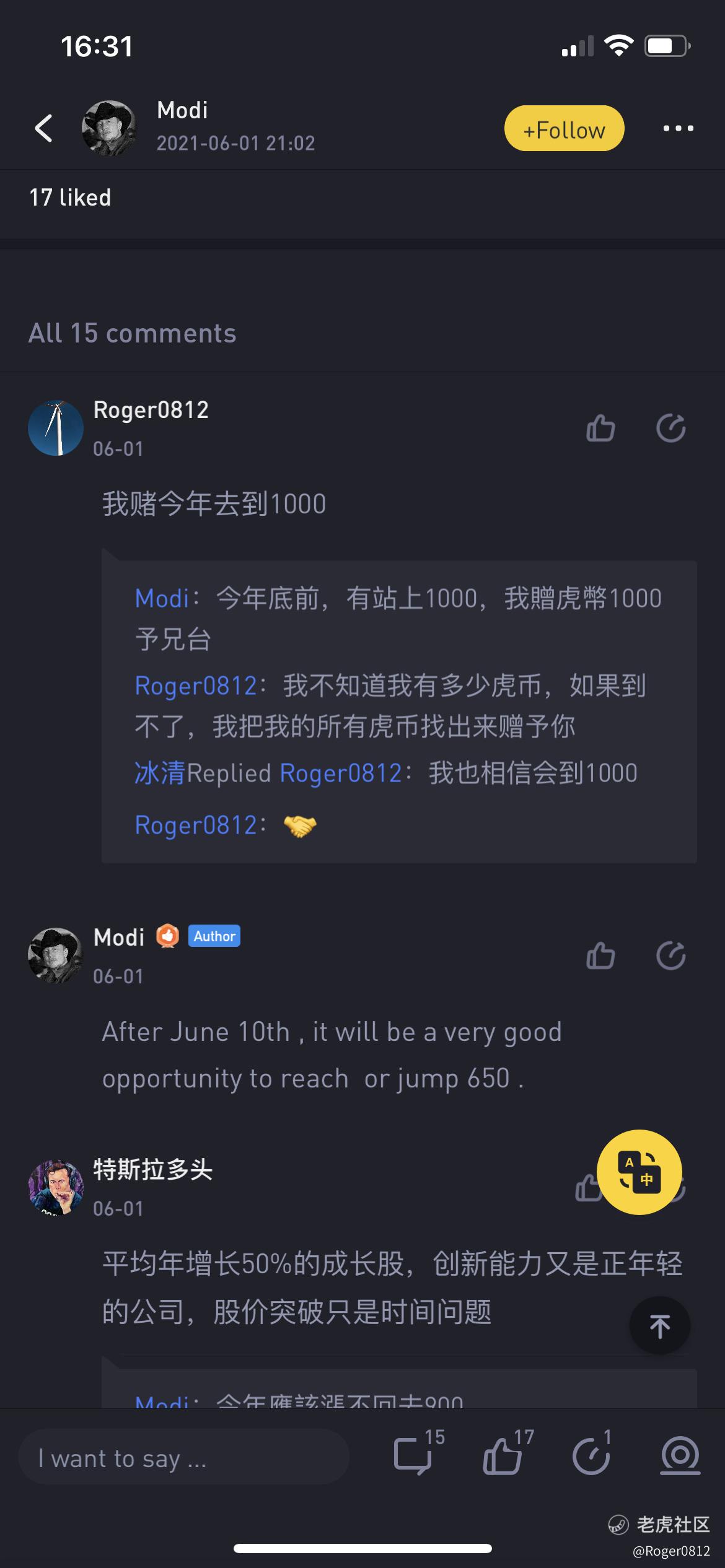 记得我在上半年和一个股友打赌说过今年特斯拉可以到1000,他承诺如果到了把老虎币给我大概1000个吧