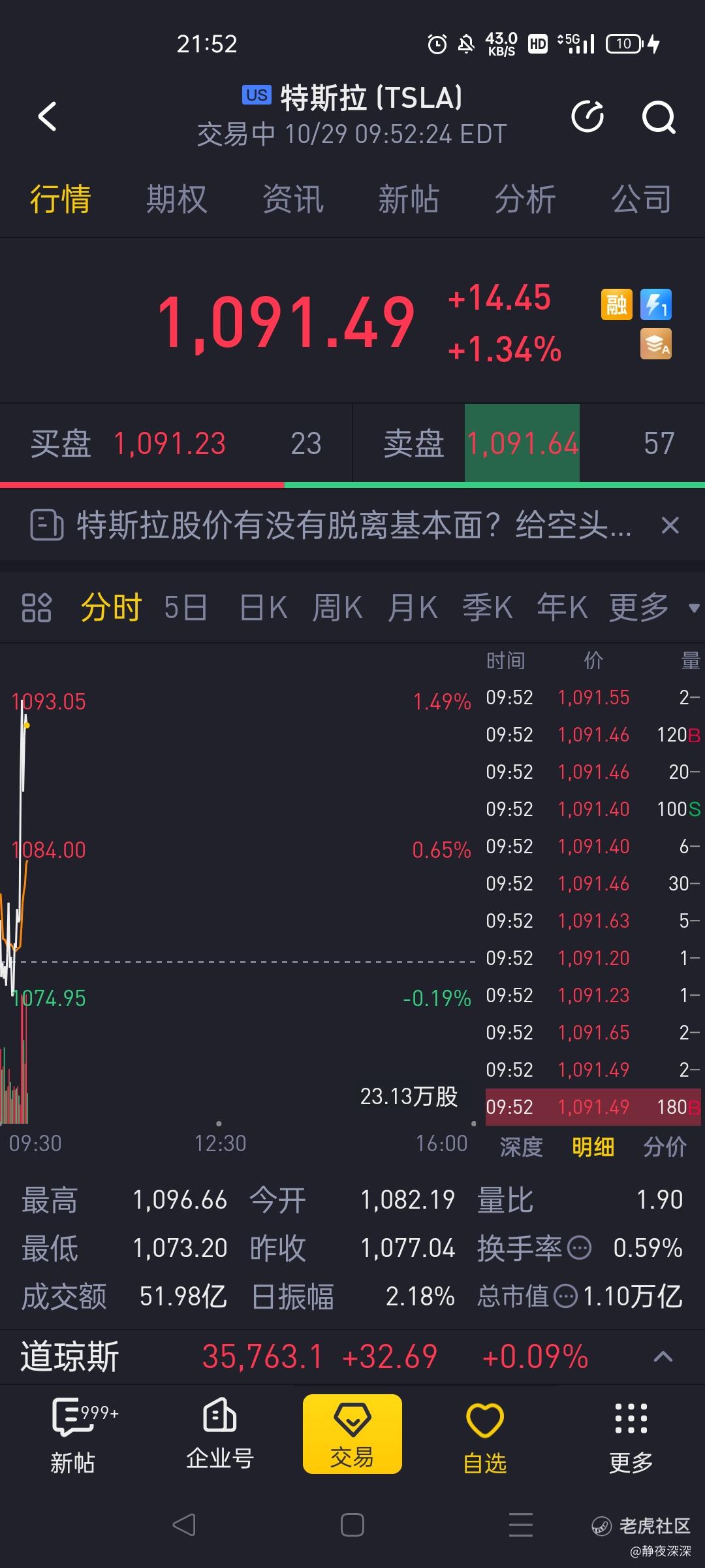 还没来得及窃喜出去了,一下就大单冲破1090,少赚150刀,没什么可懊悔的,卖在山腰就满足了,打字的时候还在冲高1093,等待下一次机会,虽然是特斯拉,但也不能追高