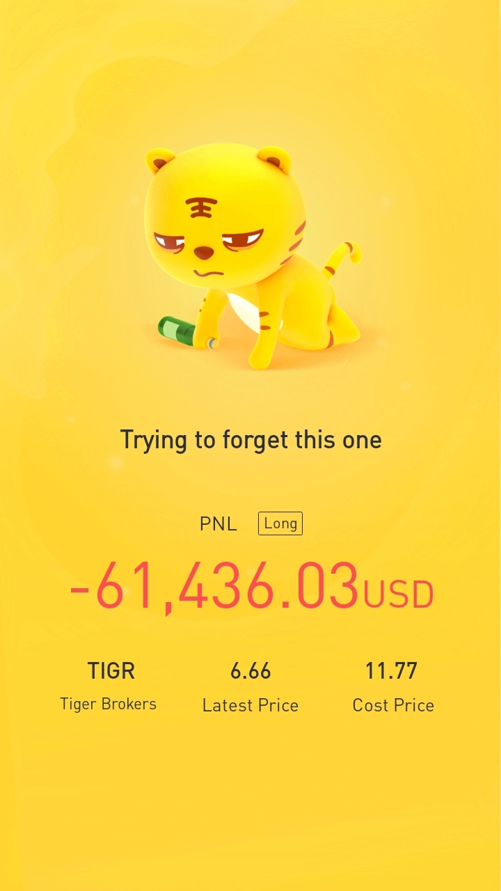 $Tiger Brokers(TIGR)$666. I am ready to stay with you for years. If I can't hold when I see only 60k red, I dun deserve you when you are 500k green.