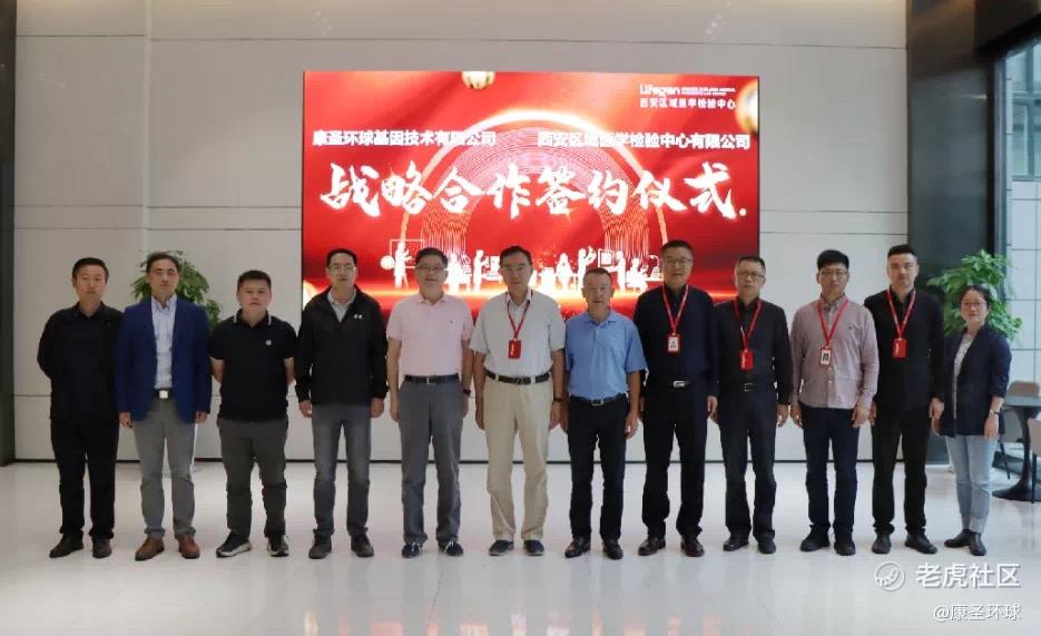 西安区域医学检验中心首席科学家郝晓柯教授,总裁张永生教授,检验中心总经理曾宪飞教授,总助颜桦博士,康圣环球基因技术有限公司总经理、集团董事涂赞兵,分公司常务副总经理李红军,营销部大区经理徐洋等出席签约仪式。