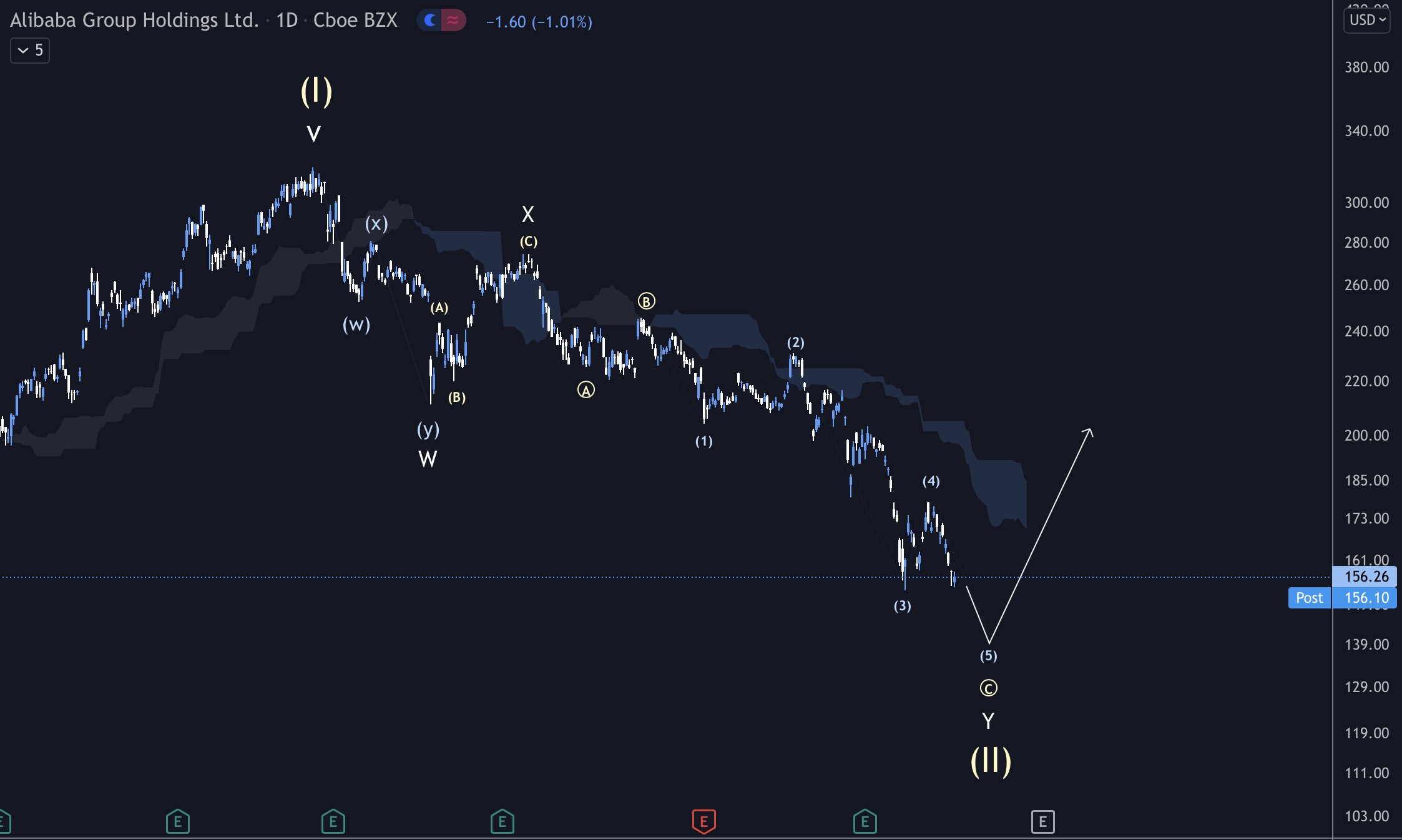 $阿里巴巴(BABA)$ I believe this stock is near the end of this long correction as we approach W-5 of C. If W-1 = W-5 will be fulfilled we can expect $BABA to bottom around $140. From there it should start a multi-year bull run for W-3 of the largest degree.(转)