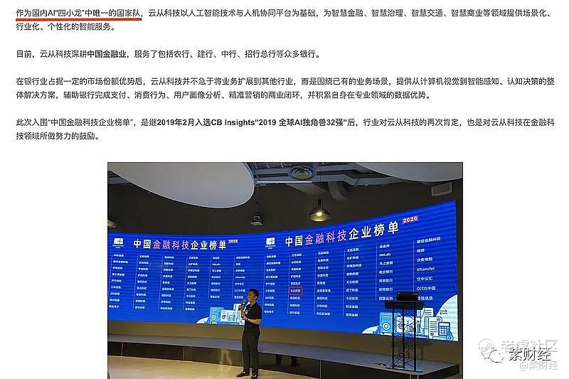 不过,云从科技有一件东西令竞争对手自愧不如:超强的自我包装能力。在官网和许多新闻通稿中,云从科技均自诩为“人工智能国家队”,瞬间甩旷视、依图、商汤几条街。紫财经第一眼看到时哑然失笑:既不是央企控股也不是国企控股,一家自称国家队的勇气到底是从哪里来的?