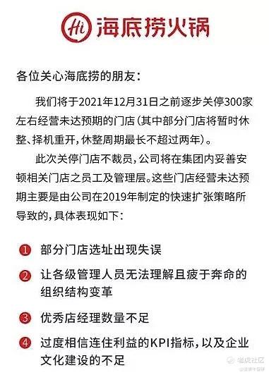 海底捞在发布的公告中用了一句最直白的话表达了关店原因:公司在2019年制定的快速扩张策略导致的。