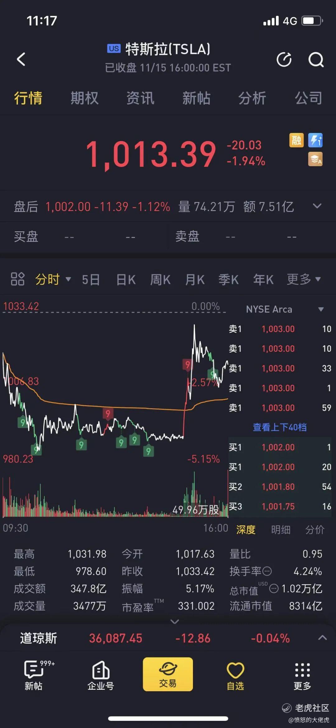 昨晚(11.15号)也是跌了5%,然后反弹起来,收盘1013,跌1.94%,市值保持在1万亿美元以上。