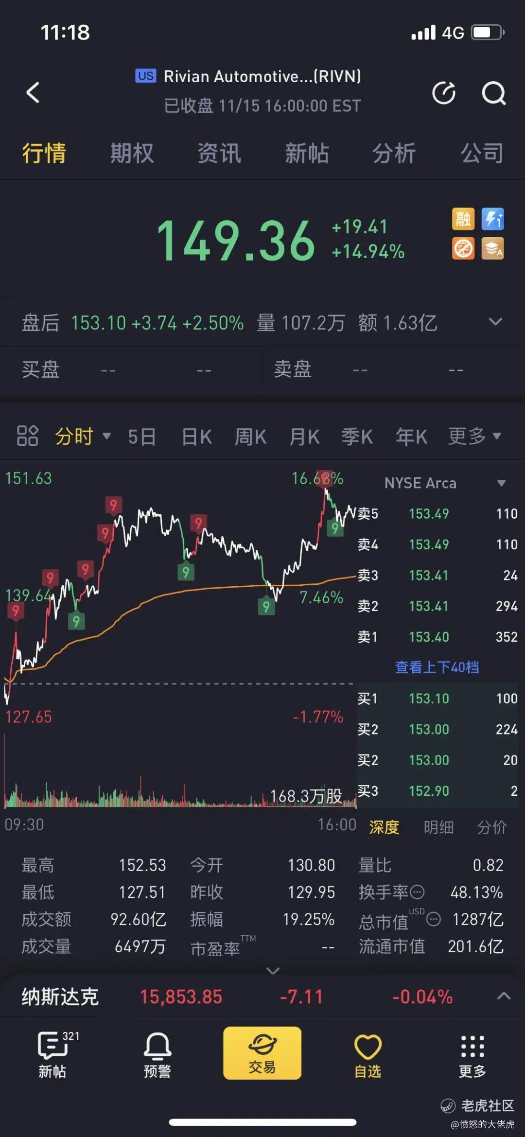 昨晚(11.15号)大涨15%,股价149,市值1287亿美元。果然还是新能源汽车的世界啊,强者恒强~