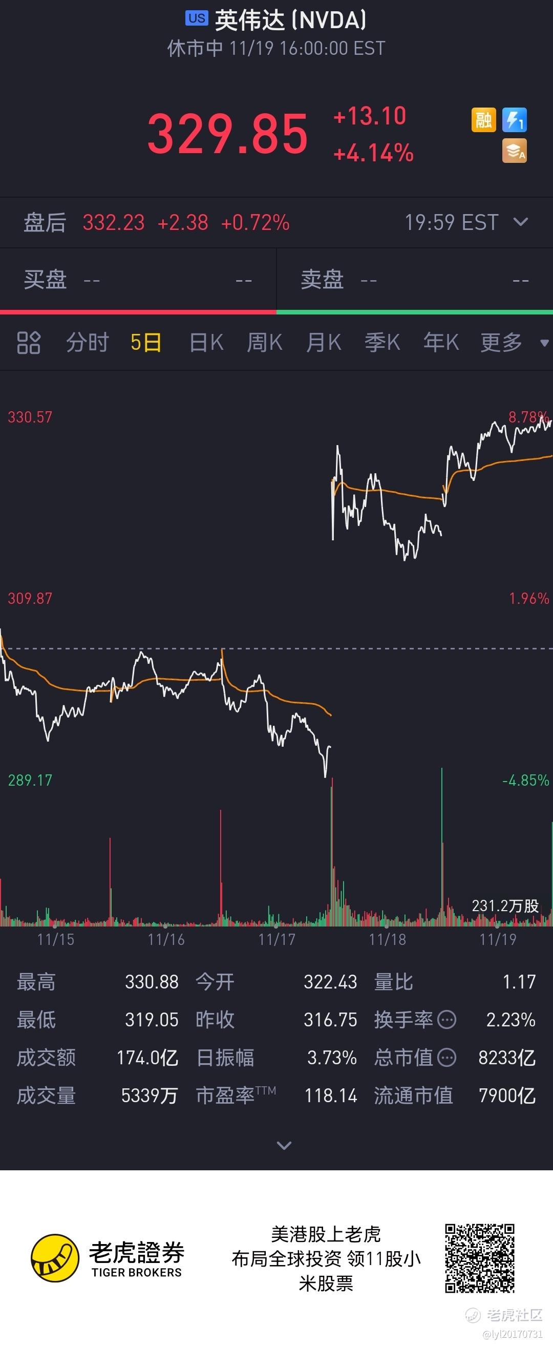 NVDA 80%概率涨到340,本周奔360 350。下砸的概率 20% 理由如下:NVDA市场疯狂 主要是看庄家 今天多空激战 看来这个多庄太凶悍了 。另一可能是下周也可能回320,但是。下到320 冲上350就更难了。这个庄今天不惜一切夺了330。下周估计又是激战。下320人气与散户就散了.下看310。 从多庄的实力与市场疯狂看 350大概率周五NVDA大资金流入五亿美元 近一二个月的日新高