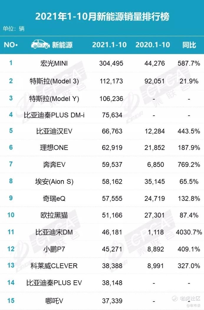 2021年1-10月新能源狭义乘用车市场的累计销量排名详见下图:
