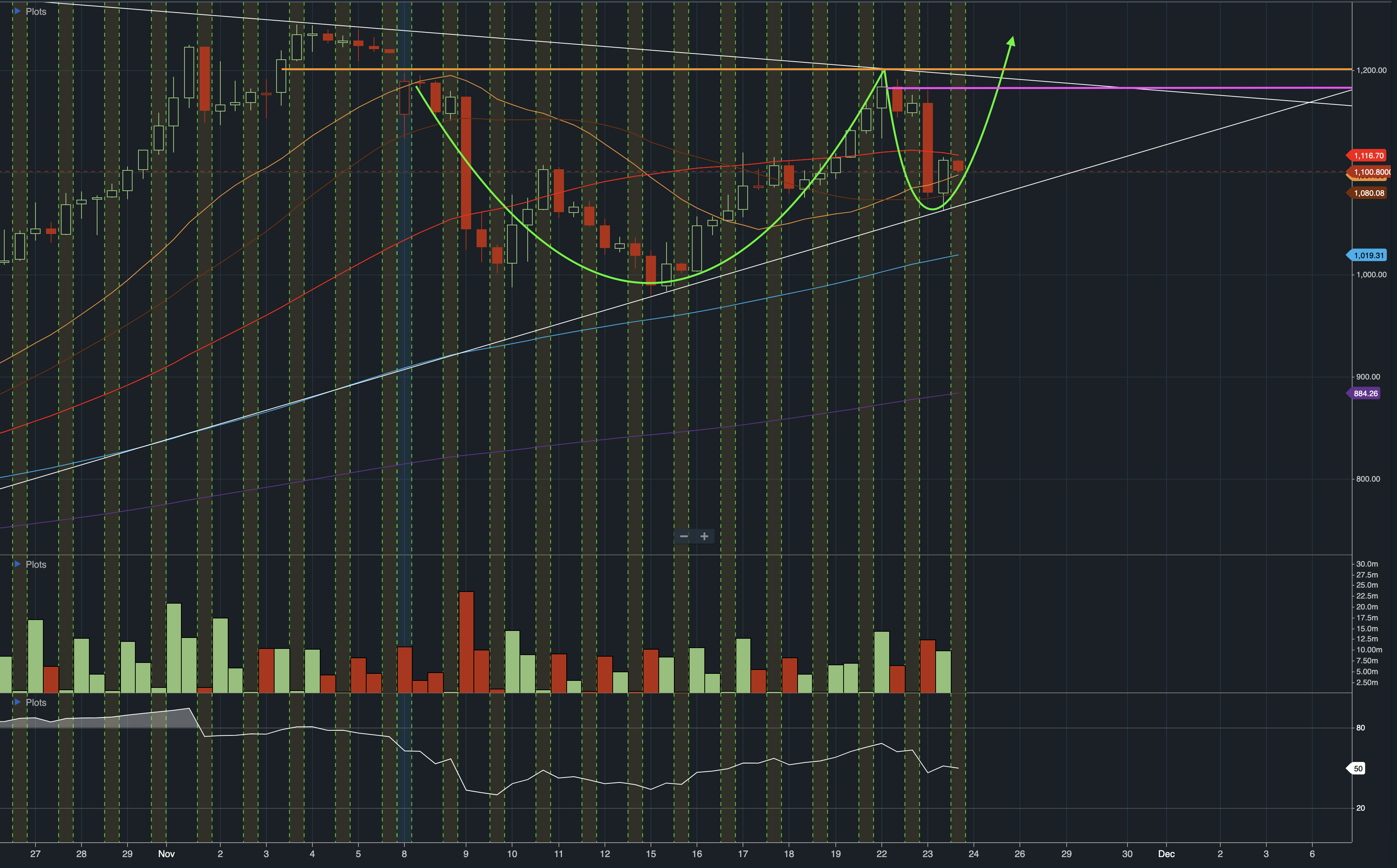 $Tesla Motors(TSLA)$ 4h chart definitely showed some strength here. Bounced off support, currently forming a handle, need to break $1200 for better confirmation. However from today's price action, i strongly believe it's a bullish setup. I wish you guys loaded way before $1070!
