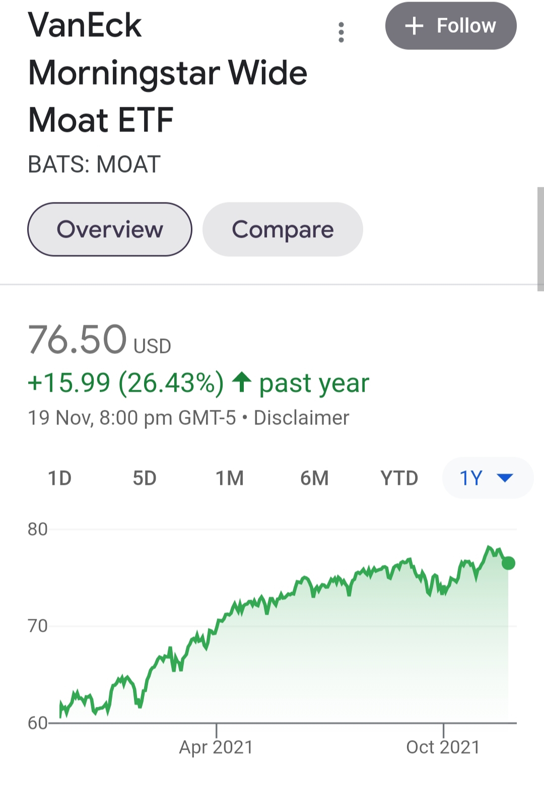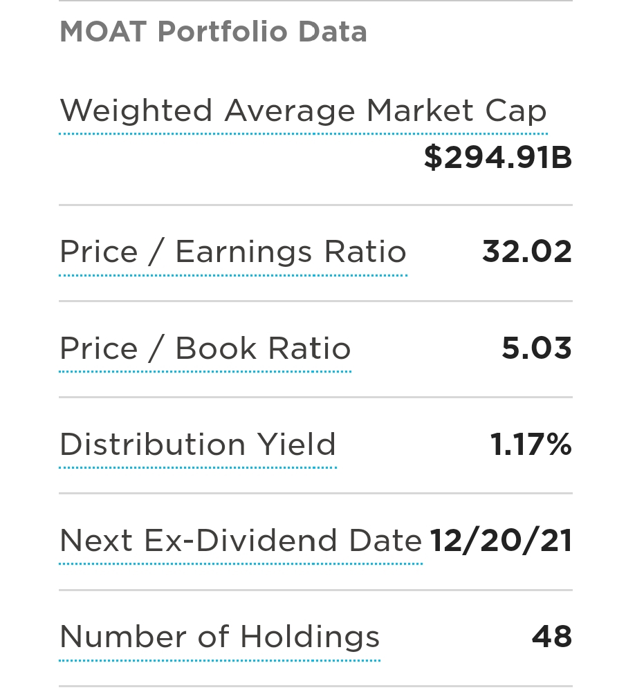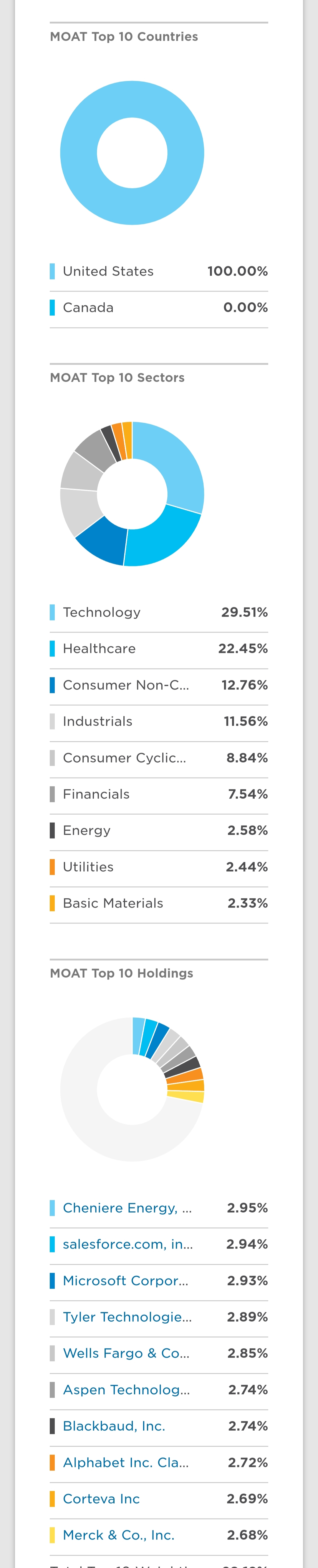MOAT ETF tracks a staggered, equal-weighted index of 40 US companies that Morningstar determines to have the highest fair value among firms with a sustainable competitive advantage. Meaning, these companies are either clear leader in their own segment or literately close to no competition. Or its cost prohibitive for their customer to switch to another companies.