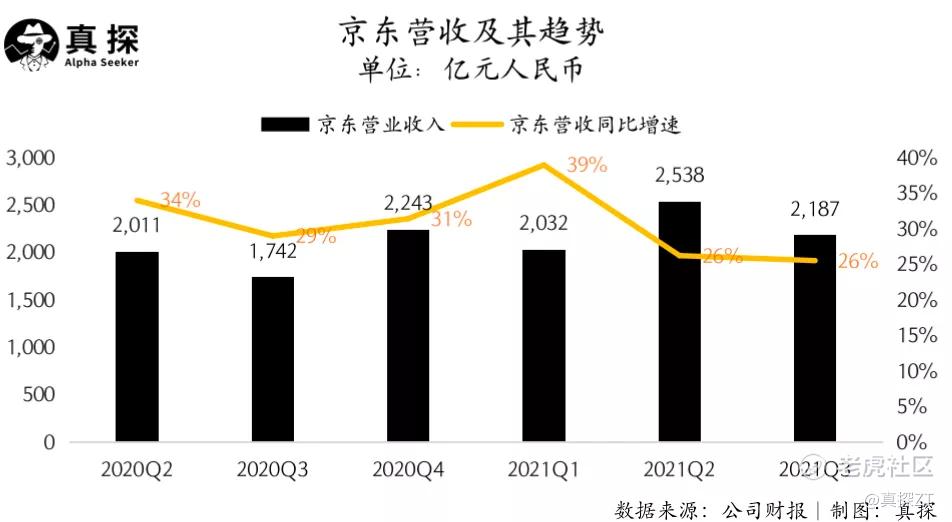 - 根据财报,京东三季度总营收为2187亿(若无说明,单位均为人民币),同比增长25.5%,超过市场预估的2156.1亿元;