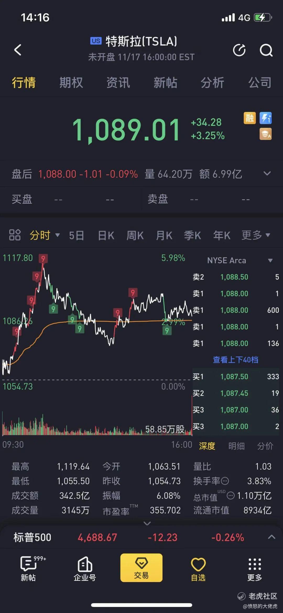 昨晚11.17号波动也是在5%以内上蹿下跳,最后收盘价1089,涨3.2%,市值1.1万亿美元。