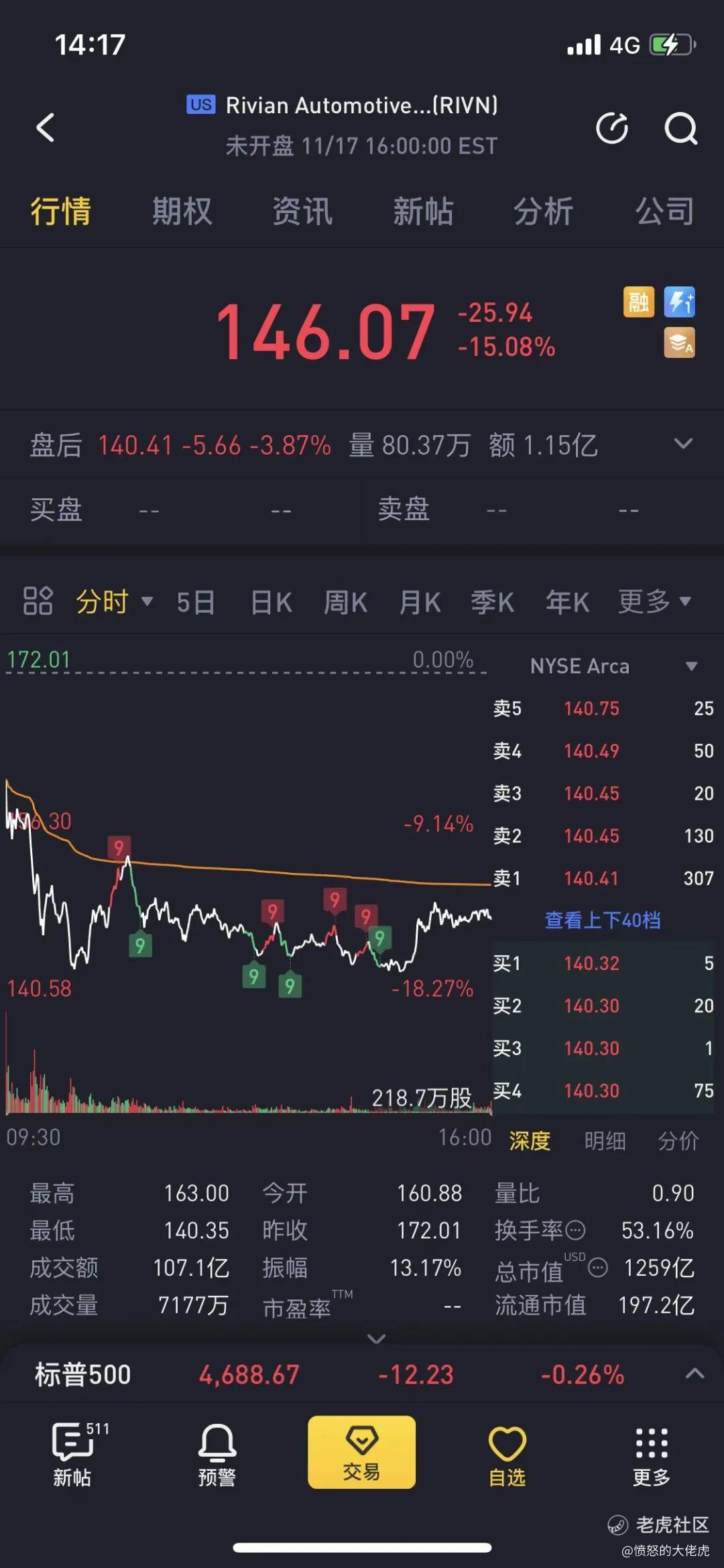 Rivian 昨晚真够刺激,盘前涨,开盘跌。收盘价146,跌15%,市值1259亿美元。