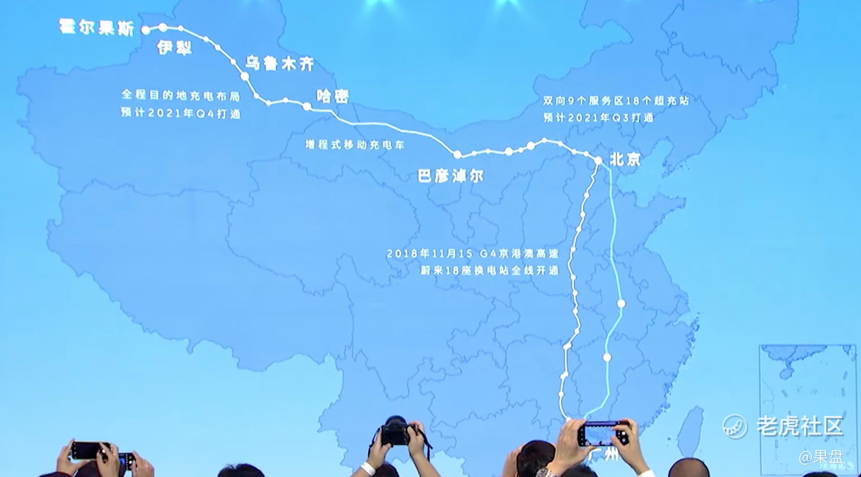 从深圳到北京,京港澳高速蔚来的换电站全线贯通,北京到内蒙的巴彦淖尔,双向服务区都部署有超充站,哈密到霍尔果斯会布局有目的地充电桩,只有巴彦淖尔到哈密,由于是大片的沙漠无人区,目前还是需要移动充电车的协助。