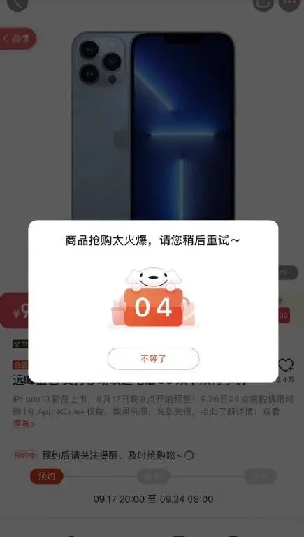 9月17日20点,iPhone 13系列正式开始预购,苹果官网页面卡顿,被挤崩溃,天猫旗舰店、京东自营店等各大电商平台开售后均秒没。随后“苹果官网崩了”登上微博实时热搜榜第一,由此可见消费者的换机热情十分高涨。