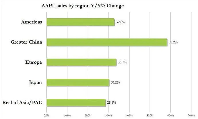 这个58%的增幅在苹果公司的美洲部门(33%)、欧洲部门(33.7%)、日本部门(30%)、亚太其他地区(28.5%)中是最强劲的。