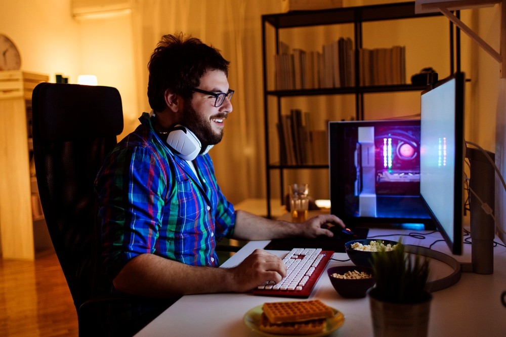 Video game developer working at his desktop.