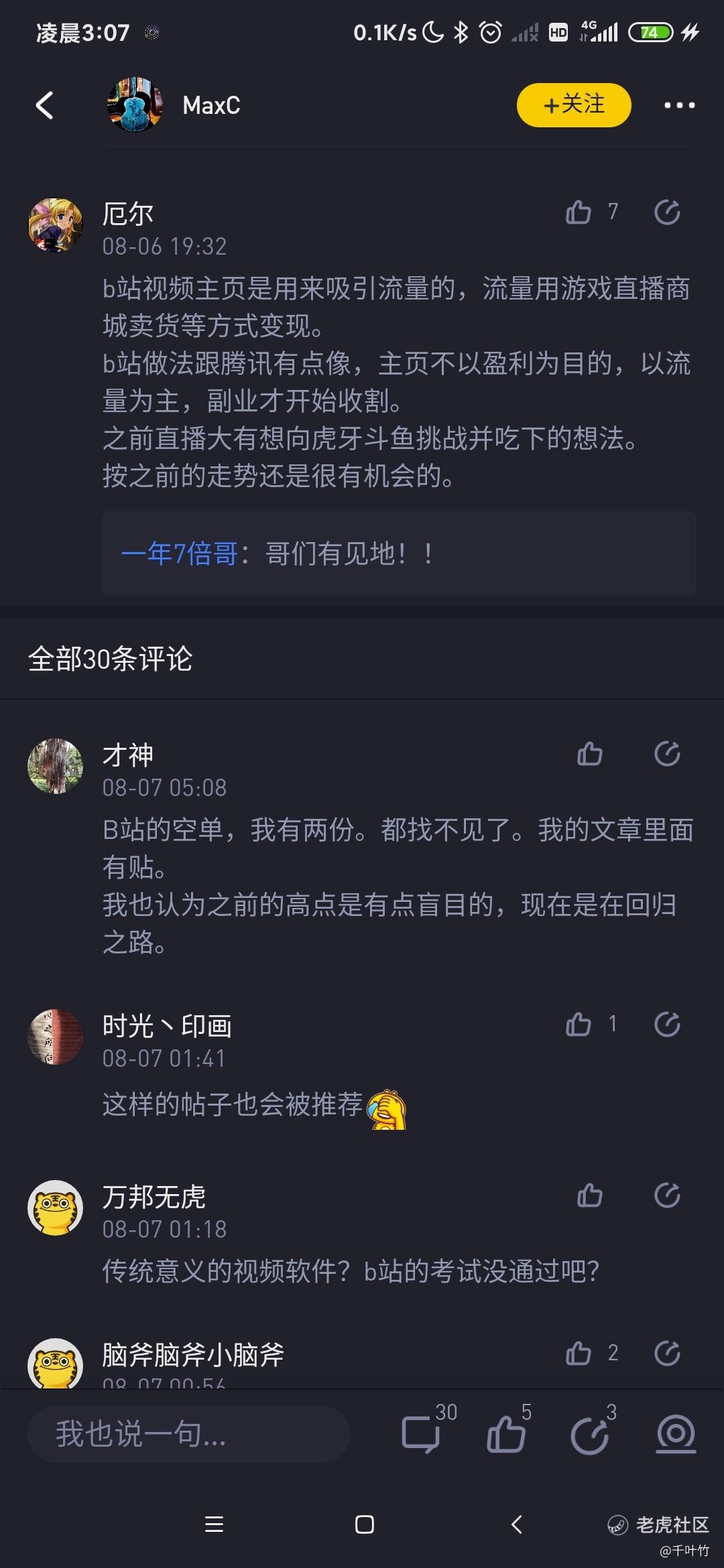 8月5号晚我在老虎看到一帖子说b站在未来没有盈利能力,我当时就笑了。你在开玩笑吗?了解过b站吗?它的盈利模式就如这位虎友所描述的一样。在这个流量为王的时代,谁有流量谁就掌握了主动权,只是缺少变现的方法罢了。知道拼多多吗?什么百亿补贴,砍一刀都是为了吸引用户啊!你记得在拼多多给好友发了多少砍一刀的链接了吗?这都是变相的宣传,有流量你还不盈利,那要么缺少变现的手段,要么真的成本真的太高了。记住好钢用在刀刃上,这句话永远是节约成本的最高手段,也不要误解这句话,这不是叫你去做假冒伪劣产品。字数有点多应该发长文的。