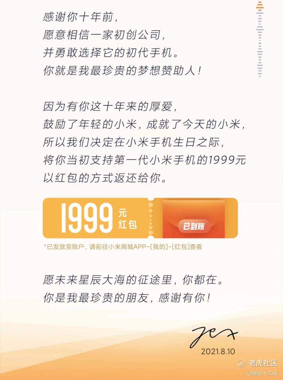 当我试了老号码登录之后,这个映入眼帘的大红包真的是太震撼了,活了这么久还真的第一次碰到这么有情怀的企业,到现在都依然还是异常的激动,还有一点挺神奇的是,这一个号十年来就只买过小米1,你能想到十年后相当于再送你一台新的1999的手机的那种激动的心情吗?就因为你十年前相信和支持过他,单凭这一点,以后无论小米的产品,还是股票都一如既往的支持。