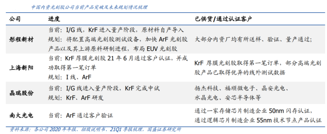 晶瑞股份、彤程新材、上海新阳等目前处于KrF通过验证或量产阶段。