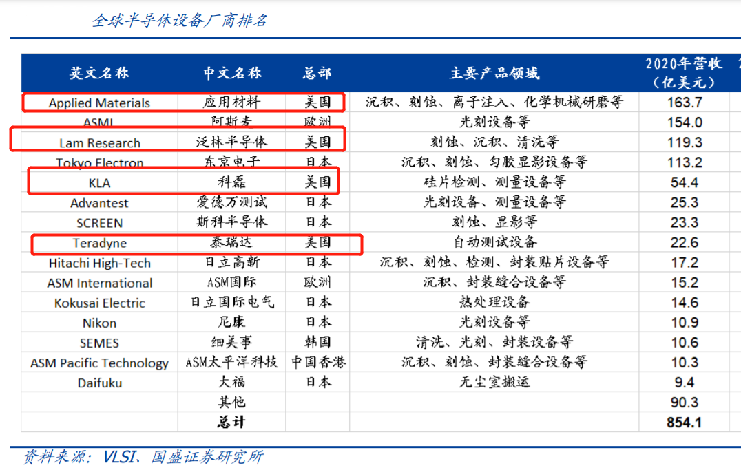 全球半导体设备厂商中,前十大厂商有4个来源于美国,合计市占率高达42.2%,几乎垄断了半导体设备的半壁江山。