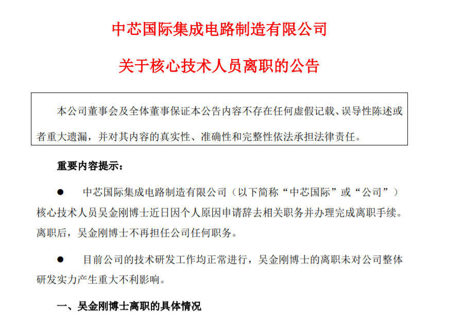 7月4日晚间,中芯发布公告称,公司核心技术人员吴金刚博士近日因个人原因申请辞去相关职务并办理完成离职手续。
