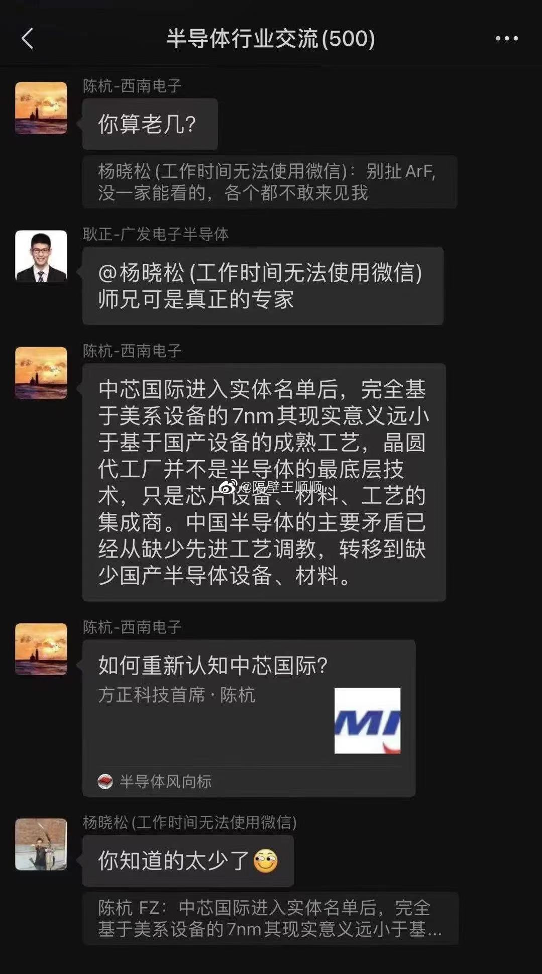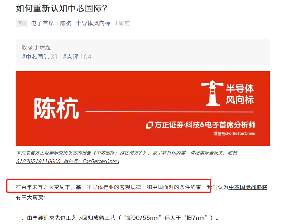 而陈杭则是发了一篇其对中芯国际研究的文章,基于目前百年未有之大变局、中国面对的条件约束下,认为“中芯国际基于美系设备7nm的现实意义小于基于国产设备的成熟工艺,且中国半导体的主要矛盾已经从缺少先进工艺**,转移到缺少国产半导体设备、材料”。
