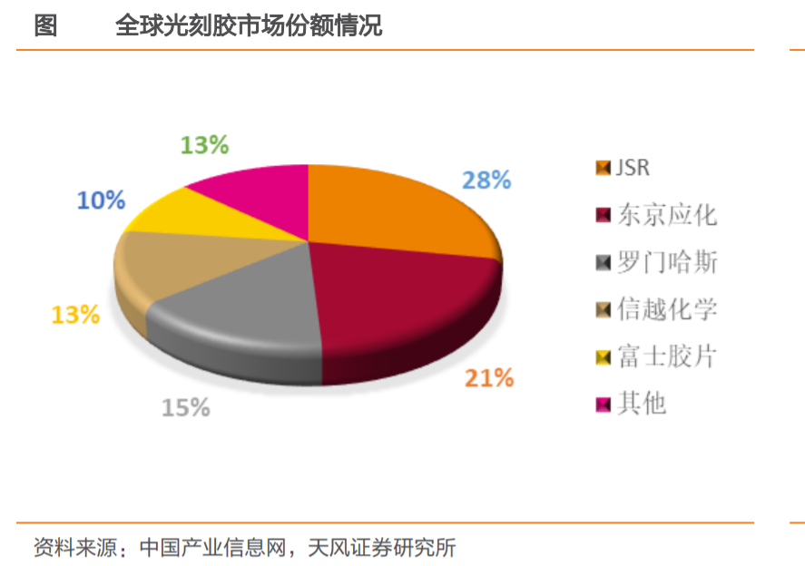 日本的JSR、东京应化、信越化学及富士胶片四家企业占据了全球70%以上的市场份额;具体到半导体光刻胶领域,他们四家也占据了60%以上的市场份额。