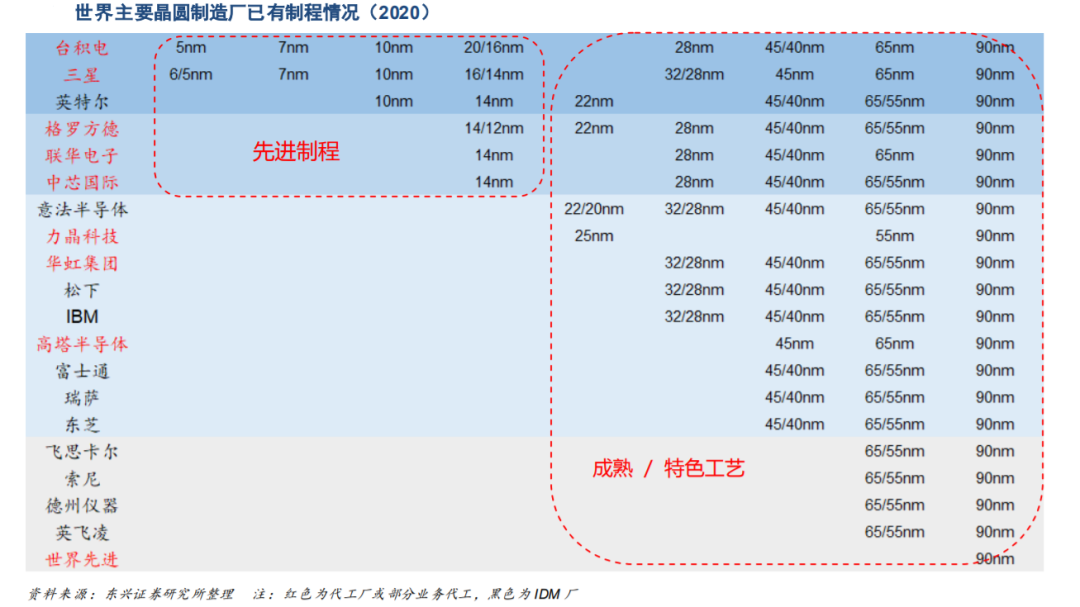 全球芯片制造第一梯队的是台积电,在先进制程上领先全球,专业代工领域占据的份额超过50%;随即是兼具代工和IDM的三星电子、格罗方德和联电。