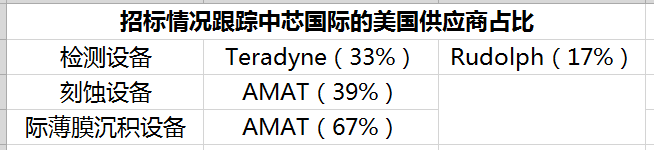 其中,检测设备有50%美国进口,刻蚀设备的美国企业占比约39%,薄膜沉积设备有39%来自美国。