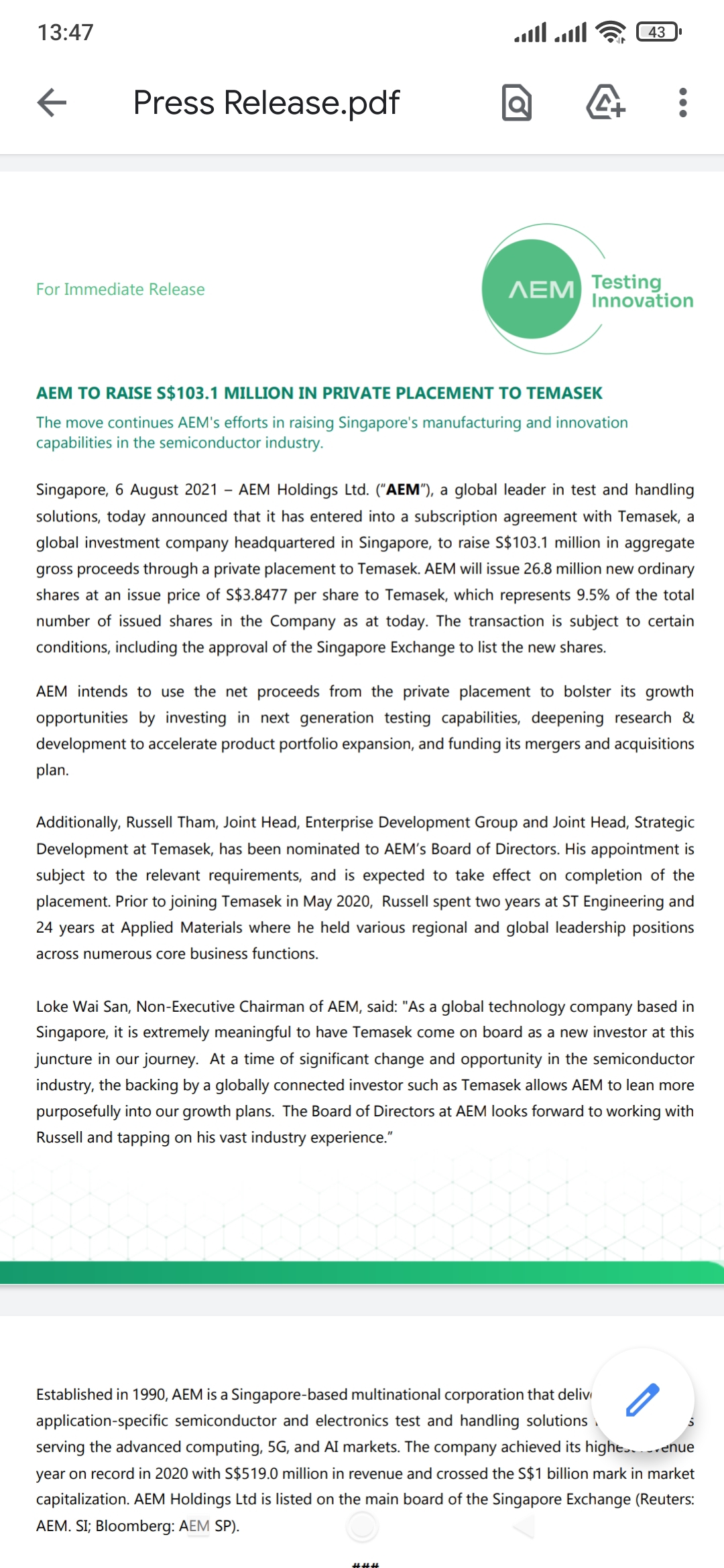 $AEM HOLDINGS LTD(AWX.SI)$ News just out!!! Private placement of shares to TEMASEK HOLDINGS. So Temasek will be a new shareholder in AEM.